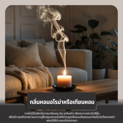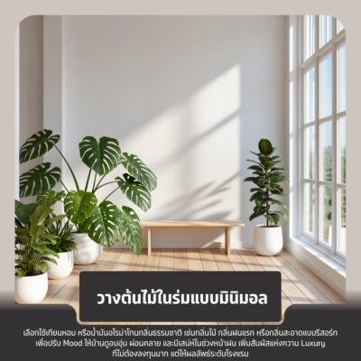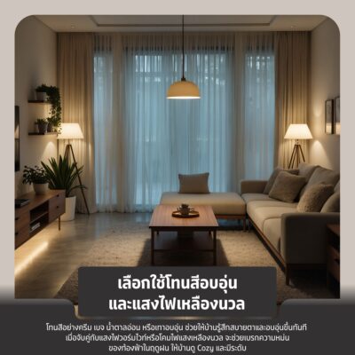 ใช้ แสงไฟวอร์มไลท์ จากโคมไฟตั้งพื้น หรือไฟซ่อนในผนัง เพื่อสร้างบรรยากาศนุ่มนวล เหมือนโรงแรมหรู